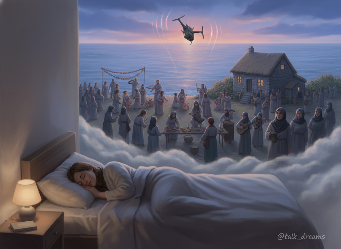 Приснилось море, мой дом был там. Праздновали праздник, вся семья помогала в приготовлении. Много людей, волонтёров. Затем заработала сирена, явилась опасность. Волонтёры убирали технику с моря, их головы замотаны шарфами, все кричат: «Дрон летит!» Дрон падает рядом с домом, не взрывается. Я в страхе — там моя мама, папа, бабушка и любимый, я их потеряла, осталась одна. Проснулась окаменевшей.